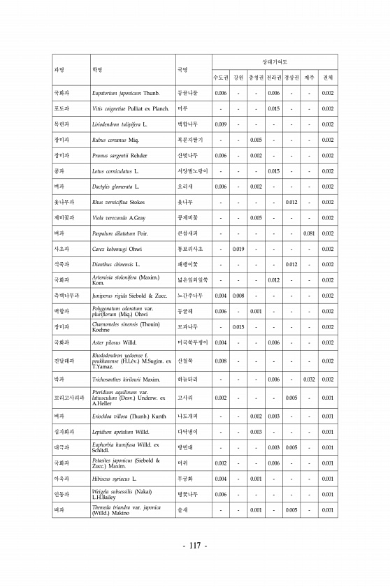 117 과명 학명 국명 상대기여도 수도권 강원 충청권 전라권 경상권 제주 전체 국화과 Eupatorium japonicum Thunb. 등골나물 0.006 0.006 0.002 포도과 Vitis coignetiae Pulliat ex Planch. 머루 0.015 0.002 목련과 Liriodendron tulipifera L. 백합나무 0.009 0.002 장미과 Rubus coreanus Miq. 복분자딸기 0.005 0.002 장미과 Prunus sargentii Rehder 산벚나무 0.006 0.002 0.002 콩과 Lotus corniculatus L. 서양벌노랑이 0.015 0.002 벼과 Dactylis glomerata L. 오리새 0.006 0.002 0.002 옻나무과 Rhus vern...