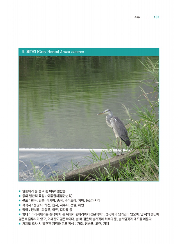 조류 ┃ 137 9. 왜가리 [Grey Heron] Ardea cinerea ■ 멸종위기 등 중요 종 여부일반종 ■ 종의 일반적 특성 여름철새 집단번식 ■ 분포 한국, 일본, 러시아, 중국, 수마트라, 자바, 동남아시아 ■ 서식지 농경지, 하천, 습지, 저수지, 갯벌, 해안 ■ 먹이 양서류, 파충류, 어류, 갑각류 등 ■ 형태 머리꼭대기는 흰색이며, 눈 위에서 뒷머리까지 검은색이다. 23개의 댕기깃이 있으며, 앞 목의 중앙에 검은색 줄무늬가 있고, 어깨깃도 검은색이다. 날 때 검은색 날개깃이 회색의 등, 날개덮깃과 대조를 이룬다. ■ 거제도 조사 시 발견된 지역과 분포 양상 가조, 장승포, 고현,거제