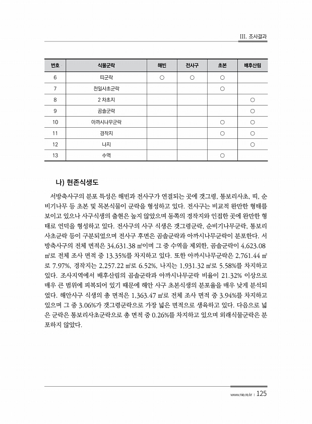 III. 조사결과 www.nie.re.kr ?125 서방축사구의 분포 특성은 해빈과 전사구가 연결되는 곳에 갯그령, 통보리사초, 띠, 순 비기나무 등 초본 및 목본식물이 군락을 형성하고 있다. 전사구는 비교적 완만한 형태를 보이고 있으나 사구식생의 출현은 높지 않았으며 동쪽의 경작지와 인접한 곳에 완만한 형 태로 언덕을 형성하고 있다. 전사구의 사구 식생은 갯그령군락, 순비기나무군락, 통보리 사초군락 등이 구분되었으며 전사구 후면은 곰솔군락과 아까시나무군락이 분포한다. 서 방축사구의 전체 면적은 34,631.38 ㎡이며 그 중 수역을 제외한, 곰솔군락이 4,623.08 ㎡로 전체 조사 면적 중 13.35%를 차지하고 있다. 또한 아까시나무군락은 2,761.44 ㎡ 로 7.97%, 경작지는 2,257.22 ㎡...