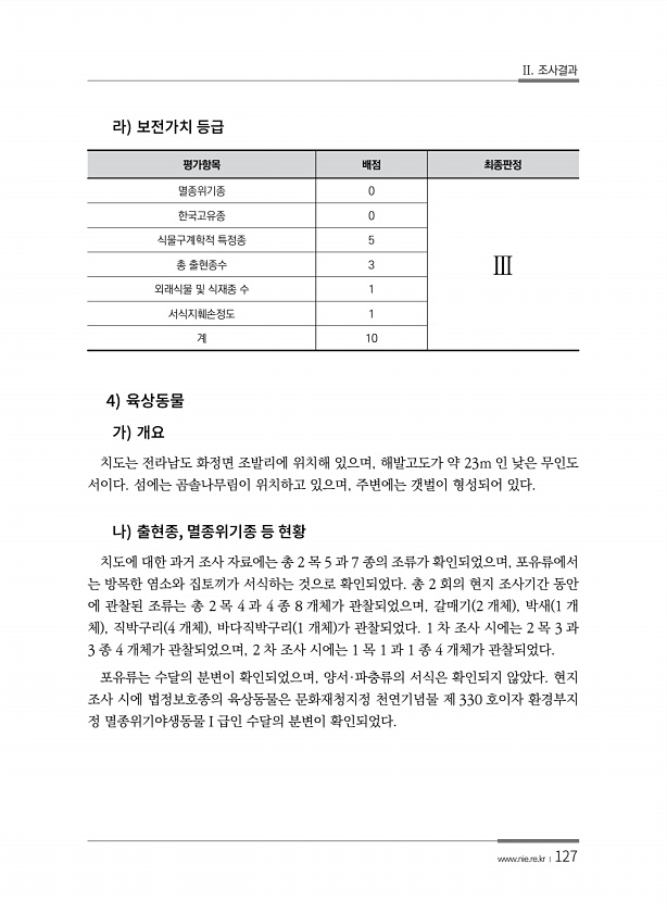 II. 조사결과 www.nie.re.kr ?127 평가항목 배점 최종판정 멸종위기종 0 Ⅲ 한국고유종 0 식물구계학적 특정종 5 총 출현종수 3 외래식물 및 식재종 수 1 서식지훼손정도 1 계 10 4 치도는 전라남도 화정면 조발리에 위치해 있으며, 해발고도가 약 23m 인 낮은 무인도 서이다. 섬에는 곰솔나무림이 위치하고 있으며, 주변에는 갯벌이 형성되어 있다. , 치도에 대한 과거 조사 자료에는 총 2 목 5 과 7 종의 조류가 확인되었으며, 포유류에서 는 방목한 염소와 집토끼가 서식하는 것으로 확인되었다. 총 2 회의 현지 조사기간 동안 에 관찰된 조류는 총 2 목 4 과 4 종 8 개체가 관찰되었으며, 갈매기 2 개체 , 박새 1 개 체 , 직박구리 4 개체 , 바다직박구리 1 개체 가 관찰되었다. ...