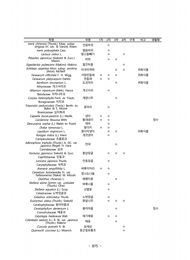 875 학명 국명 1차 2차 3차 4차 구계 비고 생활형 Ixeris chinensis Thunb. Kitag. subsp. strigosa H. L?v. & Vaniot Kitam. 선씀바귀 ㅇ Ixeris polycephala Cass. 벌씀바귀 ㅇ Lactuca indica L. 왕고들빼기 ㅇ ㅇ Petasites japonicus Siebold & Zucc. Maxim. 머위 ㅇ ㅇ Sigesbeckia pubescens Makino Makino 털진득찰 ㅇ Solidago gigantea Aiton subsp. serotina Aiton McNeill 미국미역취 ㅇ ㅇ 귀화식물 Taraxacum officinale F. H. Wigg. 서양민들레 ㅇ ㅇ ㅇ 귀화식물 Taraxacum platycar...