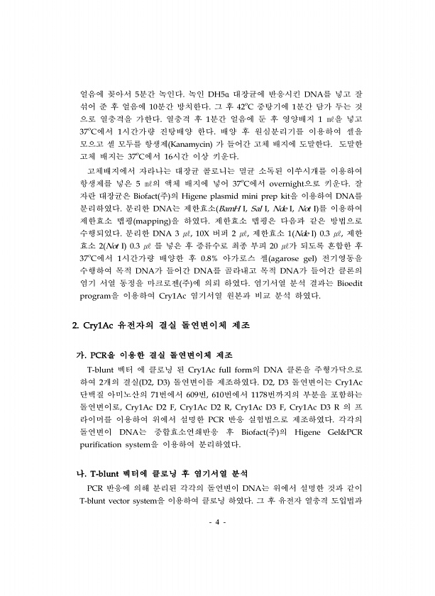 4 얼음에 꽂아서 5분간 녹인다. 녹인 DH5α 대장균에 반응시킨 DNA를 넣고 잘 섞어 준 후 얼음에 10분간 방치한다. 그 후 42oC 중탕기에 1분간 담가 두는 것 으로 열충격을 가한다. 열충격 후 1분간 얼음에 둔 후 영양배지 1 ㎖을 넣고 37oC에서 1시간가량 진탕배양 한다. 배양 후 원심분리기를 이용하여 셀을 모으고 셀 모두를 항생제 Kanamycin 가 들어간 고체 배지에 도말한다. 도말한 고체 배지는 37oC에서 16시간 이상 키운다. 고체배지에서 자라나는 대장균 콜로니는 멸균 소독된 이쑤시개를 이용하여 항생제를 넣은 5 ㎖의 액체 배지에 넣어 37oC에서 overnight으로 키운다. 잘 자란 대장균은 Biofact 주 의 Higene plasmid mini prep kit을 이용하여 DN...