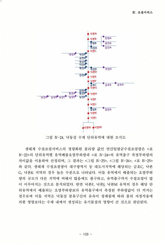Ⅳ. 조절서비스 109 그림 Ⅳ 24. 낙동강 수계 단위유역에 대한 모식도 생태계 수질조절서비스의 정량화한 물리량 값인 연간일평균수질조절량은 표 Ⅳ 22 의 단위유역별 유역배출오염부하량과 표 Ⅳ 24 의 유역출구 측정부하량의 차이값을 이용하여 산정되며, 그 결과는 그림 Ⅳ 25 , 그림 Ⅳ 26 , 표 Ⅳ 25 와 같다. 생태계 수질조절량이 대구광역시 등 대도시지역에 해당되는 금호C, 낙본 G, 낙본K 지역의 경우 높은 수준으로 나타났다. 이들 유역에서 배출되는 오염부하 량의 규모가 다른 지역에 비해서 많음에도 불구하고, 유역출구까지 수질조절이 많 이 이루어지는 것으로 분석되었다. 반면 낙본F, 낙본J, 낙본M 유역의 경우 해당 단 위유역에서 배출되는 오염부하량보다 유역출구에서 측정된 부하량값이 더 커지는 ...