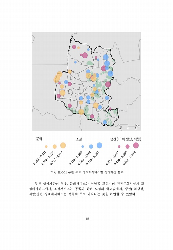 115 [그림 Ⅲ-3-1] 부천 주요 생태계서비스별 생태자산 분포 부천 생태자산의 경우, 문화서비스는 서남쪽 도심지의 전통문화시설과 도 심테마파크에서, 조절서비스는 동쪽의 산과 도심의 학교숲에서, 생산 1차생산, 식량 관련 생태계서비스는 북쪽에 주로 나타나는 것을 확인할 수있었다.