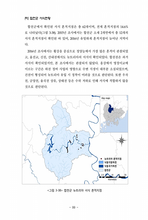 합천군에서 확인된 서식 흔적지점은 총 62개이며, 전체 흔적지점의 14.6% 로 나타났다 그림 3-38 2015년 조사에서는 합천군 소재 2개면에서 총 12개의 서식 흔적지점이 확인된 바 있어, 2016년 유일하게 흔적지점이 늘어난 지역이 다. 2016년 조사에서는 황강을 중심으로 정양늪에서 가장 많은 흔적이 관찰되었 고, 율진교, 신천, 산내천에서도 뉴트리아의 서식이 확인되었다. 합천천은 과거 서식이 확인되었지만, 본 조사에서는 관찰되지 않았다. 옹강에서 영창이교에 이르는 구간은 하천 정비 사업의 영향으로 수변 식생이 대부분 소실되었으며, 건천이 형성되어 뉴트리아 유입 시 정착이 어려울 것으로 판단된다. 또한 우곡 천, 금양천, 율곡천 상류, 상태천 등은 수위 저하로 인해 서식에 적합하지 않을 것으로 판단...