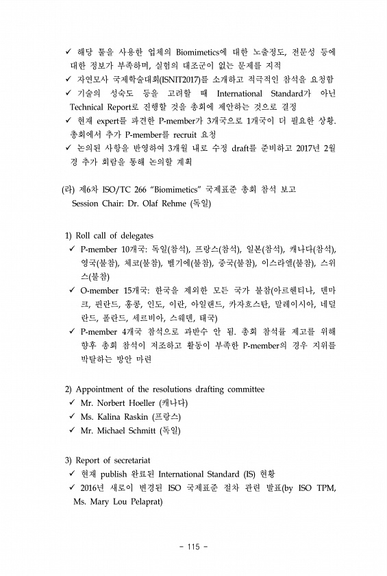 115 해당 툴을 사용한 업체의 Biomimetics에 대한 노출정도, 전문성 등에 대한 정보가 부족하며, 실험의 대조군이 없는 문제를 지적 자연모사 국제학술대회 ISNIT2017 를 소개하고 적극적인 참석을 요청함 기술의 성숙도 등을 고려할 때 International Standard가 아닌 Technical Report로 진행할 것을 총회에 제안하는 것으로 결정 현재 expert를 파견한 P-member가 3개국으로 1개국이 더 필요한 상황. 총회에서 추가 P-member를 recruit 요청 논의된 사항을 반영하여 3개월 내로 수정 draft를 준비하고 2017년 2월 경 추가 회람을 통해 논의할 계획 라 제6차 ISO/TC 266 “Biomimetics” 국제표준 총회 참석 보고 Session Cha...