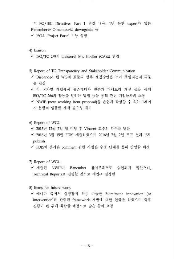 116 * ISO/IEC Directives Part 1 변경 내용1년 동안 expert가 없는 P-member는 O-member로 downgrade 등 ISO의 Project Portal 기능 설명 4 Liaison ISO/TC 279의 Liaison을 Mr. Hoeller CA 로 변경 5 Report of TG Transparency and Stakeholder Communication Disbanded 된 WG의 표준의 향후 개정방안은 누가 책임지는지 의문 을 던짐 각 국가별 레벨에서 뉴스레터와 전문가 디렉토리 개설 등을 통해 ISO/TC 266의 활동을 알리는 방법 등을 통해 관련 기업들과의 소통 NWIP new working item proposal 을 손쉽게 작성할 수 있는 1페이 지 분량의 템...
