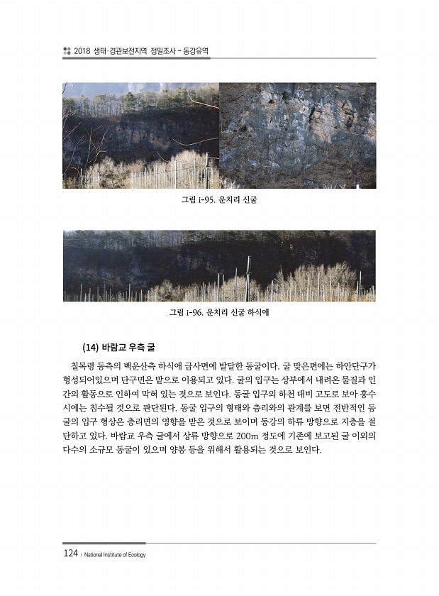 2018 생태·경관보전지역 정밀조사 동강유역 124 ? National Institute of Ecology 그림 i-95. 운치리 신굴 그림 i-96. 운치리 신굴 하식애 14 칠목령 동측의 백운산측 하식애 급사면에 발달한 동굴이다. 굴 맞은편에는 하안단구가 형성되어있으며 단구면은 밭으로 이용되고 있다. 굴의 입구는 상부에서 내려온 물질과 인 간의 활동으로 인하여 막혀 있는 것으로 보인다. 동굴 입구의 하천 대비 고도로 보아 홍수 시에는 침수될 것으로 판단된다. 동굴 입구의 형태와 층리와의 관계를 보면 전반적인 동 굴의 입구 형상은 층리면의 영향을 받은 것으로 보이며 동강의 하류 방향으로 지층을 절 단하고 있다. 바람교 우측 굴에서 상류 방향으로 200m 정도에 기존에 보고된 굴 이외의 다수의 소규모 동굴...