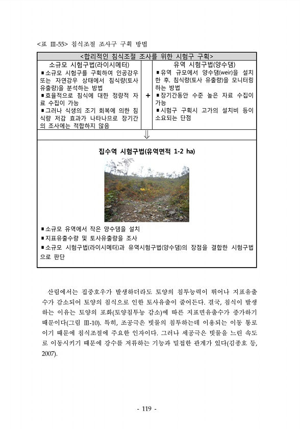 합리적인 침식조절 조사를 위한 시험구 구획 소규모 시험구법 라이시메터 ?소규모 시험구를 구획하여 인공강우 또는 자연강우 상태에서 침식량 토사 유출량 을 분석하는 방법 ?효율적으로 침식에 대한 정량적 자 료 수집이 가능 ?그러나 식생의 조기 회복에 의한 침 식량 저감 효과가 나타나므로 장기간 의 조사에는 적합하지 않음 + 유역 시험구법 양수댐 ?유역 규모에서 양수댐 weir 을 설치 한 후, 침식량 토사 유출량 을 모니터링 하는 방법 ?장기간동안 수준 높은 자료 수집이 가능 ?시험구 구획시 고가의 설치비 등이 소요되는 단점 ? 집수역 시험구법 유역면적 1-2 ha ?소규모 유역에서 작은 양수댐을 설치 ?지표유출수량 및 토사유출량을 조사 ?소규모 시험구법 라이시메터 과 유역시험구법 양수댐 의 장점을 결합한 시험...