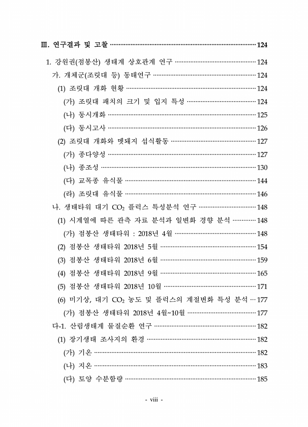 viii Ⅲ. 연구결과 및 고찰 ·····················································································124 1. 강원권 점봉산 생태계 상호관계 연구 ···············································124 가. 개체군 조릿대 등 동태연구 ····························································124 1 조릿대 개화 현황 ···········································································124 가 조릿대 패치의 크기 및 입지 특성 ·························...