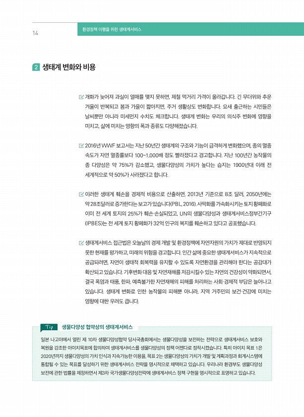 14 환경정책 이행을 위한 생태계서비스 개화가 늦어져 과실이 열매를 맺지 못하면, 제철 먹거리 가격이 올라갑니다. 긴 무더위와 추운 겨울이 반복되고 봄과 가을이 짧아지면, 주거 생활상도 변화합니다. 요새 출근하는 시민들은 날씨뿐만 아니라 미세먼지 수치도 체크합니다. 생태계 변화는 우리의 의식주 변화에 영향을 미치고, 삶에 미치는 영향의 폭과 종류도 다양해졌습니다. 2016년 WWF 보고서는 지난 50년간 생태계의 구조와 기능이 급격하게 변화했으며, 종의 멸종 속도가 자연 멸종률보다 1001,000배 정도 빨라졌다고 경고합니다. 지난 100년간 농작물의 종 다양성은 약 75%가 감소했고, 생물다양성의 가치가 높다는 습지는 1900년대 이래 전 세계적으로 약 50%가 사라졌다고 합니다. 이러한 생태계 훼손을 경...