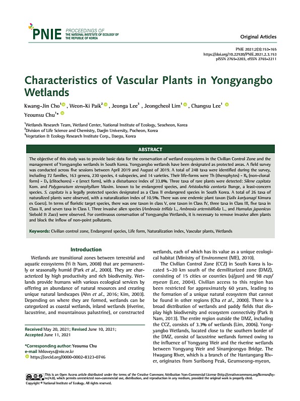 Kwang-Jin Cho1 , Weon-Ki Paik2 , Jeonga Lee3 , Jeongcheol Lim1 , Changsu Lee1 Yeounsu Chu1* Characteristics of Vascular Plants in Yongyangbo Wetlands ABSTRACT Introduction The objective of this study was to provide basic data for the conservation of wetland ecosystems in the Civilian Control Zone and the management of Yongyangbo wetlands in South Korea. Yongyangbo wetlands have been designated as ...