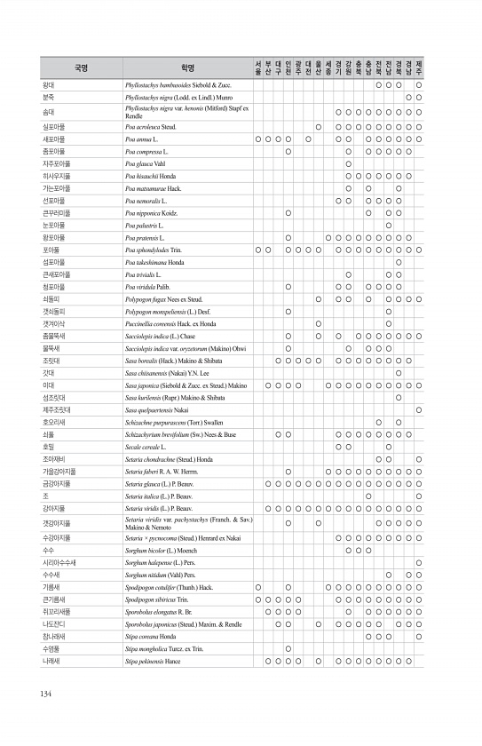 134 왕대 Phyllostachys bambusoides Siebold & Zucc. ○ ○ ○ ○ 분죽 Phyllostachys nigra Lodd. ex Lindl. Munro ○ ○ 솜대 Phyllostachys nigra var. henonis Mitford Stapf ex Rendle ○ ○ ○ ○ ○ ○ ○ ○ ○ 실포아풀 Poa acroleuca Steud. ○ ○ ○ ○ ○ ○ ○ ○ ○ ○ 새포아풀 Poa annua L. ○ ○ ○ ○ ○ ○ ○ ○ ○ ○ ○ ○ ○ 좀포아풀 Poa compressa L. ○ ○ ○ ○ ○ ○ ○ 자주포아풀 Poa glauca Vahl ○ 히사우지풀 Poa hisauchii Honda ○ ○ ○ ○ ○ ○ ○ 가는포아풀 Poa matsumurae Hack....