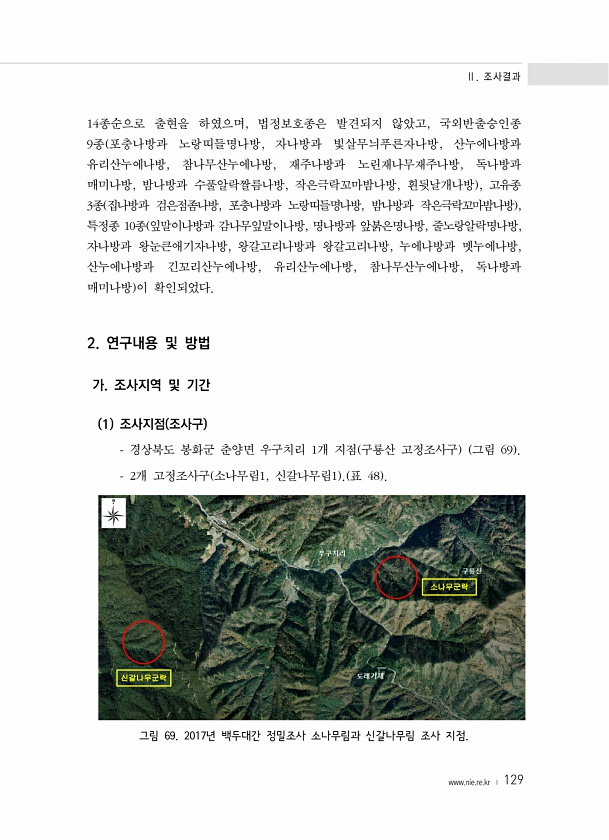 Ⅱ. 조사결과 www.nie.re.kr ? 129 14종순으로 출현을 하였으며, 법정보호종은 발견되지 않았고, 국외반출승인종 9종 포충나방과 노랑띠들명나방, 자나방과 빛살무늬푸른자나방, 산누에나방과 유리산누에나방, 참나무산누에나방, 재주나방과 노린재나무재주나방, 독나방과 매미나방, 밤나방과 수풀알락짤름나방, 작은극락꼬마밤나방, 흰뒷날개나방 , 고유종 3종 집나방과 검은점좀나방, 포충나방과 노랑띠들명나방, 밤나방과 작은극락꼬마밤나방 , 특정종 10종 잎말이나방과 감나무잎말이나방, 명나방과 앞붉은명나방, 줄노랑알락명나방, 자나방과 왕눈큰애기자나방, 왕갈고리나방과 왕갈고리나방, 누에나방과 멧누에나방, 산누에나방과 긴꼬리산누에나방, 유리산누에나방, 참나무산누에나방, 독나방과 매미나방 이 확인되었다. 2. 연구내용 ...