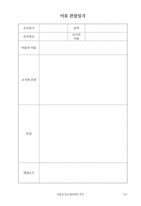 낙동강 담수생태계의 주인 137 어류 관찰일지 조사일시 날씨 조사장소 조사자 이름 어류의 이름 크기와 모양 특징채집도구