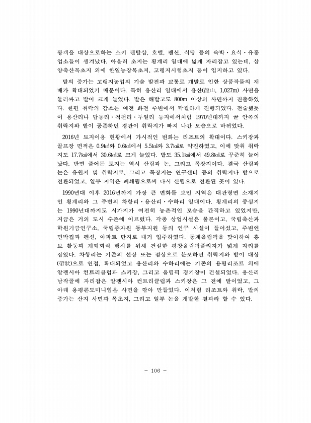106 광객을 대상으로하는 스키 렌탈샵, 호텔, 펜션, 식당 등의 숙박?요식?유흥 업소들이 생겨났다. 아울러 초지는 횡계리 일대에 넓게 자리잡고 있는데, 삼 양축산목초지 외에 한일농장목초지, 고랭지시험초지 등이 입지하고 있다. 밭의 증가는 고랭지농업의 기술 발전과 교통로 개발로 인한 상품작물의 재 배가 확대되었기 때문이다. 특히 용산리 일대에서 용산 龍山, 1,027m 사면을 둘러싸고 밭이 크게 늘었다. 밭은 해발고도 800m 이상의 사면까지 진출하였 다. 한편 취락의 감소는 예전 화전 주변에서 탁월하게 진행되었다. 전술했듯 이 용산리나 탑동리?척천리?두일리 등지에서처럼 1970년대까지 골 안쪽의 취락지와 밭이 공존하던 경관이 취락지가 빠져 나간 모습으로 바뀌었다. 2016년 토지이용 현황에서 가시적인 변화...