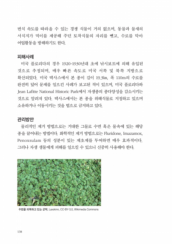 138 번식 속도를 따라올 수 있는 경쟁 식물이 거의 없으며, 동물과 물새의 서식지가 먹이를 제공해 주던 토착식물의 자리를 뺏고, 수로를 막아 어업활동을 방해하기도 한다. 피해사례 미국 플로리다의 경우 1920-1930년대 초에 낚시보트에 의해 유입된 것으로 추정되며, 매우 빠른 속도로 미국 서쪽 및 북쪽 지방으로 확산되었다. 미국 텍사스에서 본 종이 길이 19.3㎞, 폭 110m의 수로를 완전히 덮어 문제를 일으킨 사례가 보고된 적이 있으며, 미국 플로리다와 Jean Lafitte National Historic Park에서 자생종의 종다양성을 감소시키는 것으로 알려져 있다. 텍사스에서는 본 종을 위해식물로 지정하고 있으며 소유하거나 이동시키는 것을 법으로 금지하고 있다. 관리방안 물리적인 제거 방법으로는...