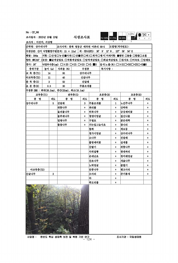 124 No CP_N6 조사일자 2015년 10월 13일 조사자 이선미, 서상령 식생조사표 군락명상수리나무 조사지역충북 영동군 매곡면 어촌리 68-5 도엽명 격자번호 식생상관산지 낙엽활엽수림면적15 × 15㎡ 위·경도 GPS 36° 9′ 12″N , 127° 58′ 54″E 해발390m 지형□산정□능선■사면 □상■중□하 □계곡□평지 미세지형■평면 □돌출 □함몰□요철 방위NW 310° 토양■갈색삼림토 □적황색삼림토 □암적색삼림토 □회갈색삼림토 □침식토 □미숙토 □암쇄토 경사26° 낙엽부식층 cm □≥20 □ 15 □ 10 □ 5 ■0 암석노 출 % □≥51□ 50□ 25□ 5■0 층위구분 높이 m 식피율 % 우점종 특기사항 교 목 층 T1 14 95 상수리나무 아교목층 T2 11 40 신갈나무 관 목 층 S ...