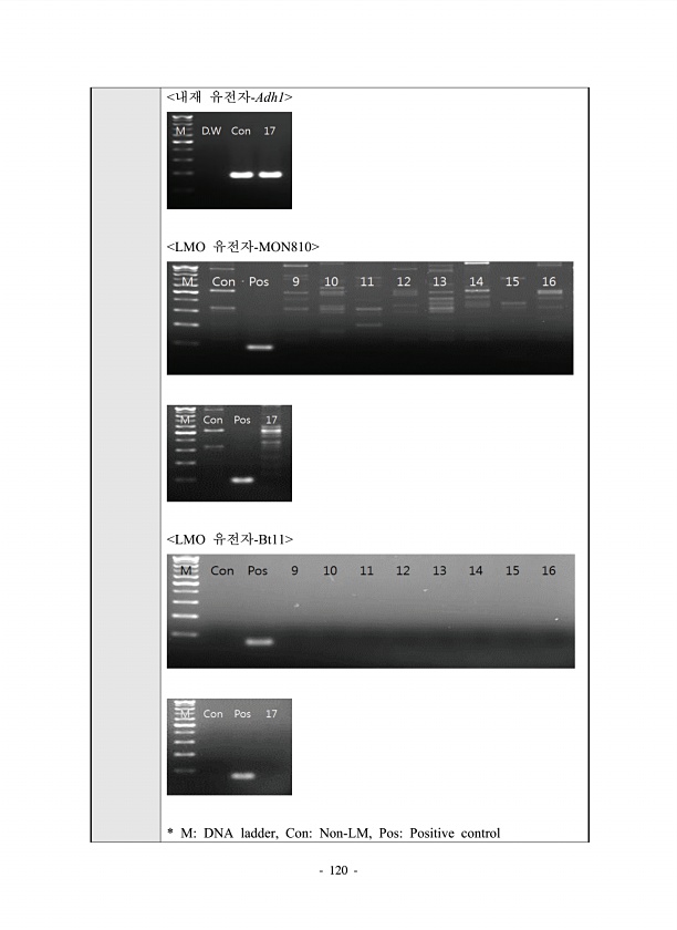 120 내재 유전자-Adh1 LMO 유전자-MON810 LMO 유전자-Bt11 * MDNA ladder, ConNon-LM, PosPositivecontrol