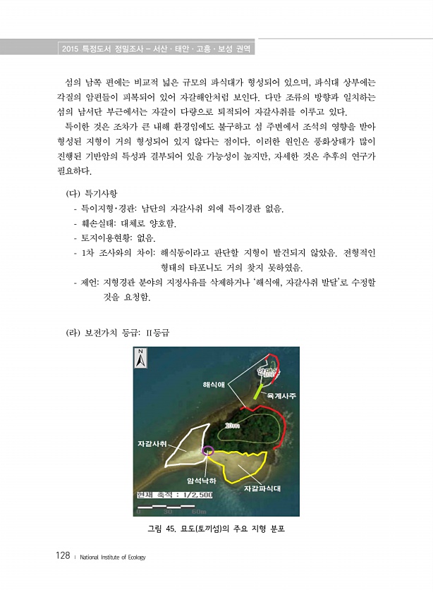 2015 특정도서 정밀조사 서산·태안·고흥·보성 권역 128 ? National Institute of Ecology 섬의 남쪽 편에는 비교적 넓은 규모의 파식대가 형성되어 있으며, 파식대 상부에는 각질의 암편들이 피복되어 있어 자갈해안처럼 보인다. 다만 조류의 방향과 일치하는 섬의 남서단 부근에서는 자갈이 다량으로 퇴적되어 자갈사취를 이루고 있다. 특이한 것은 조차가 큰 내해 환경임에도 불구하고 섬 주변에서 조석의 영향을 받아 형성된 지형이 거의 형성되어 있지 않다는 점이다. 이러한 원인은 풍화상태가 많이 진행된 기반암의 특성과 결부되어 있을 가능성이 높지만, 자세한 것은 추후의 연구가 필요하다. 다 특기사항 특이지형?경관남단의 자갈사취 외에 특이경관 없음. 훼손실태대체로 양호함. 토지이용현황없음. 1차 ...
