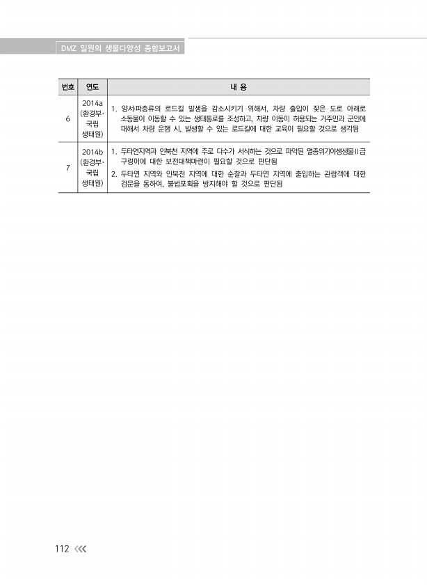 DMZ 일원의 생물다양성 종합보고서 112 번호 연도 내 용 6 2014a 환경부· 국립 생태원 1. 양서?파충류의 로드킬 발생을 감소시키기 위해서, 차량 출입이 잦은 도로 아래로 소동물이 이동할 수 있는 생태통로를 조성하고, 차량 이동이 허용되는 거주민과 군인에 대해서 차량 운행 시, 발생할 수 있는 로드킬에 대한 교육이 필요할 것으로 생각됨 7 2014b 환경부· 국립 생태원 1. 두타연지역과 인북천 지역에 주로 다수가 서식하는 것으로 파악된 멸종위기야생생물Ⅱ급 구렁이에 대한 보전대책마련이 필요할 것으로 판단됨 2. 두타연 지역와 인북천 지역에 대한 순찰과 두타연 지역에 출입하는 관람객에 대한 검문을 통하여, 불법포획을 방지해야 할 것으로판단됨