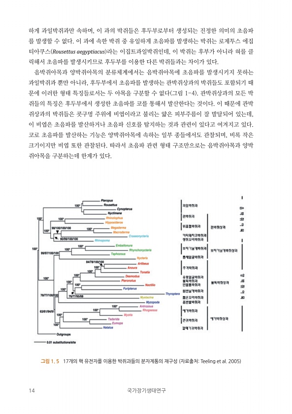 14 국가장기생태연구 그림 1. 5 17개의 핵 유전자를 이용한 박쥐과들의 분자계통의 재구성 자료출처Teeling et al. 2005 하게 과일박쥐과만 속하며, 이 과의 박쥐들은 후두부로부터 생성되는 진정한 의미의 초음파 를 발생할 수 없다. 이 과에 속한 박쥐 중 유일하게 초음파를 발생하는 박쥐는 로제투스 에집 티아쿠스 Rousettus aegyptiacus 라는 이집트과일박쥐인데, 이 박쥐는 후부가 아니라 혀를 클 릭해서 초음파를 발생시키므로 후두부를 이용한 다른 박쥐들과는 차이가 있다. 음박쥐아목과 양박쥐아목의 분류체계에서는 음박쥐아목에 초음파를 발생시키지 못하는 과일박쥐과 뿐만 아니라, 후두부에서 초음파를 발생하는 관박쥐상과의 박쥐들도 포함되기 때 문에 이러한 형태 특징들로서는 두 아목을 구분할 수...