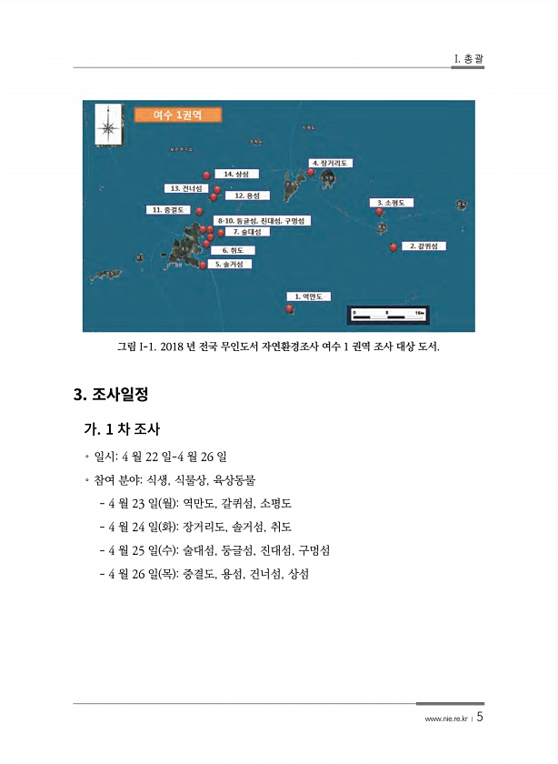 I. 총 괄 www.nie.re.kr ? 5 그림 I-1. 2018 년 전국 무인도서 자연환경조사 여수 1 권역 조사 대상 도서. 3. 1 ? 일시4 월 22 일-4 월 26 일 ? 참여 분야식생, 식물상, 육상동물 4 월 23 일 월 역만도, 갈퀴섬, 소평도 4 월 24 일 화 장거리도, 솔거섬, 취도 4 월 25 일 수 술대섬, 둥글섬, 진대섬, 구멍섬 4 월 26 일 목 중결도, 용섬, 건너섬,상섬