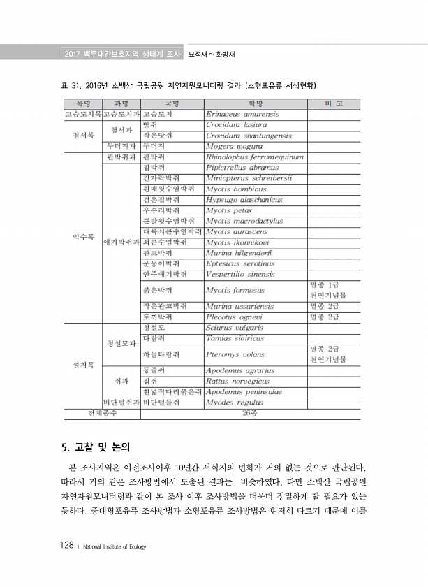 2017 백두대간보호지역 생태계 조사 묘적재 화방재 128 ? National Institute of Ecology 표 31. 2016년 소백산 국립공원 자연자원모니터링 결과 소형포유류 서식현황 5. 고찰 및 논의 본 조사지역은 이전조사이후 10년간 서식지의 변화가 거의 없는 것으로 판단된다. 따라서 거의 같은 조사방법에서 도출된 결과는 비슷하였다. 다만 소백산 국립공원 자연자원모니터링과 같이 본 조사 이후 조사방법을 더욱더 정밀하게 할 필요가 있는 듯하다. 중대형포유류 조사방법과 소형포유류 조사방법은 현저히 다르기 때문에이를