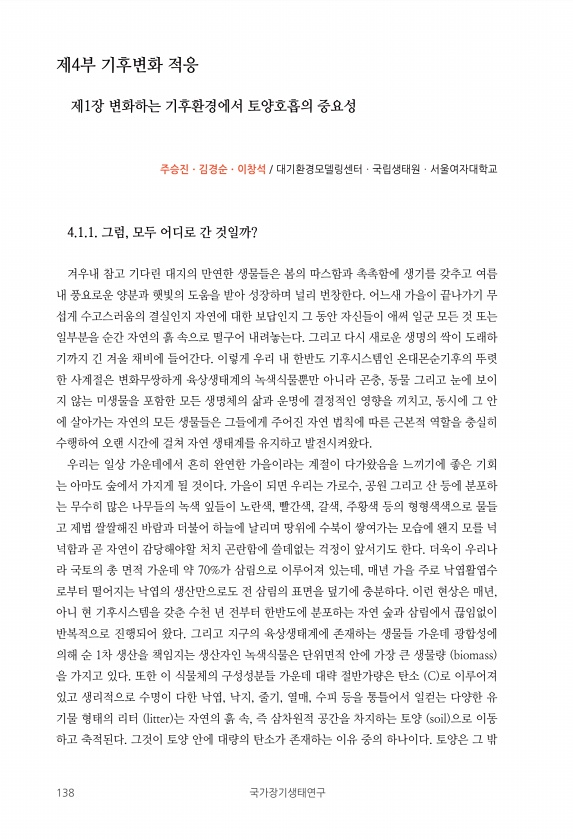 138 국가장기생태연구 제4부 기후변화 적응 제1장 변화하는 기후환경에서 토양호흡의 중요성 주승진ㆍ김경순ㆍ이창석 대기환경모델링센터ㆍ국립생태원ㆍ서울여자대학교 4.1.1. 그럼, 모두 어디로 간 것일까? 겨우내 참고 기다린 대지의 만연한 생물들은 봄의 따스함과 촉촉함에 생기를 갖추고 여름 내 풍요로운 양분과 햇빛의 도움을 받아 성장하며 널리 번창한다. 어느새 가을이 끝나가기 무 섭게 수고스러움의 결실인지 자연에 대한 보답인지 그 동안 자신들이 애써 일군 모든 것 또는 일부분을 순간 자연의 흙 속으로 떨구어 내려놓는다. 그리고 다시 새로운 생명의 싹이 도래하 기까지 긴 겨울 채비에 들어간다. 이렇게 우리 내 한반도 기후시스템인 온대몬순기후의 뚜렷 한 사계절은 변화무쌍하게 육상생태계의 녹색식물뿐만 아니라 곤충, 동...