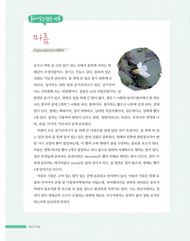창녕 우포늪 좀더알고싶은식물 마름 호수나 연못 등 고인 물이 있는 곳에서 흔하게 자라는 한 해살이 수생식물이다. 줄기는 가늘고 길다. 물속의 잎은 깃꼴로 가늘게 갈라진다. 물 위에 뜬 잎은 줄기 위쪽에 모 여난다. 잎자루는 연한 털과 공기주머니가 있다. 공기주머 니는 긴타원형 또는 피침형이다. 잎몸은 난상 마름모꼴이다. 잎 앞면은 윤기가 있고, 뒷면은 잎줄 위에 긴 털이 많다. 꽃은 79월에 잎겨드랑이에서 물 위로 나온 꽃자루 끝에 1개씩 79월에 피며, 흰색이다. 꽃자루는 짧으나 나중에 길게 되며, 겉에 털이 난다. 열매는 핵과이며, 겉이 딱딱하고, 납작한 역삼각형이며, 검은색이고, 양쪽에 뿔이 2개 있다. 종자는 식용하며 밤맛이 난다고 물밤, 말밤이라고도 부른다. 우리나라 전역에 나 며, 유럽, 아시아,...