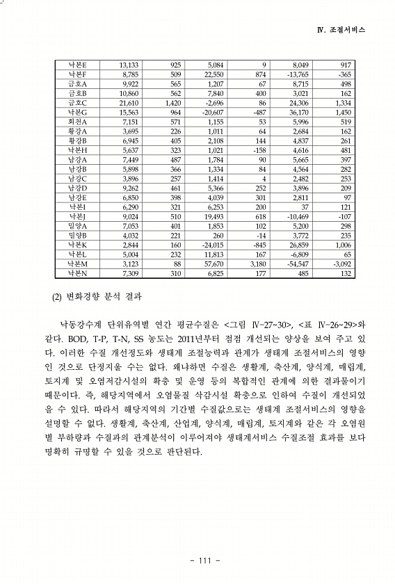 Ⅳ. 조절서비스 111 2 변화경향 분석 결과 낙동강수계 단위유역별 연간 평균수질은 그림 Ⅳ 2730 , 표 Ⅳ 2629 와 같다. BOD, T-P, T-N, SS 농도는 2011년부터 점점 개선되는 양상을 보여 주고 있 다. 이러한 수질 개선정도와 생태계 조절능력과 관계가 생태계 조절서비스의 영향 인 것으로 단정지울 수는 없다. 왜냐하면 수질은 생활계, 축산계, 양식계, 매립계, 토지계 및 오염저감시설의 확충 및 운영 등의 복합적인 관계에 의한 결과물이기 때문이다. 즉, 해당지역에서 오염물질 삭감시설 확충으로 인하여 수질이 개선되었 을 수 있다. 따라서 해당지역의 기간별 수질값으로는 생태계 조절서비스의 영향을 설명할 수 없다. 생활계, 축산계, 산업계, 양식계, 매립계, 토지계와 같은 각 오염원 별 부하량...