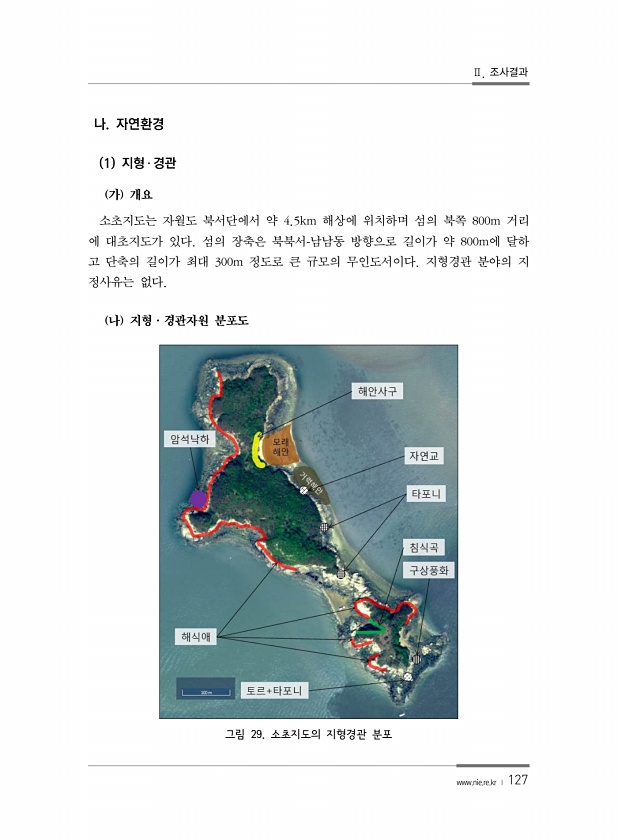 Ⅱ. 조사결과 www.nie.re.kr ? 127 나. 자연환경 1 지형 ? 경관 가 개요 소초지도는 자월도 북서단에서 약 4.5km 해상에 위치하며 섬의 북쪽 800m 거리 에 대초지도가 있다. 섬의 장축은 북북서-남남동 방향으로 길이가 약 800m에 달하 고 단축의 길이가 최대 300m 정도로 큰 규모의 무인도서이다. 지형경관 분야의 지 정사유는 없다. 나 지형·경관자원 분포도 그림 29. 소초지도의 지형경관분포