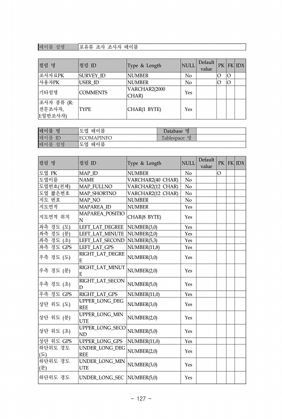 127 테이블 설명 포유류 조사 조사자 테이블 컬럼 명 컬럼 ID Type & Length NULL Default value PK FK IDX 조사자료PK SURVEY_ID NUMBER No O O 사용자PK USER_ID NUMBER No O O 기타설명 COMMENTS VARCHAR2 2000 CHAR Yes 조사자 종류 R전문조사자, I일반조사자 TYPE CHAR 1 BYTE Yes 테이블 명 도엽 테이블 Database 명 테이블 ID ECOMAPINFO Tablespace 명 테이블 설명 도엽 테이블 컬럼 명 컬럼 ID Type & Length NULL Default value PK FK IDX 도엽 PK MAP_ID NUMBER No O 도엽이름 NAME VARCHAR2 40 CHAR No 도엽번...