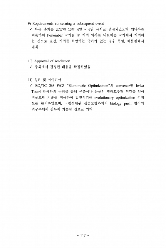 117 9 Requirements concerning a subsequent event 다음 총회는 2017년 10월 4일 6일 사이로 결정되었으며 캐나다를 비롯하여 P-member 국가들 중 개최 의사를 내보이는 국가에서 개최하 는 것으로 결정. 개최를 희망하는 국가가 없는 경우 독일, 베를린에서 개최 10 Approval of resolution 총회에서 결정된 내용을 확정하였음 11 성과 및 아이디어 ISO/TC 266 WG3 “Biomimetic Optimization”의 convenor인 Iwiza Tesari 박사와의 논의를 통해 곤충이나 동물의 형태로부터 영감을 얻어 생물모방 기술을 적용하여 발전시키는 evolutionary optimization 키워 드를 논의하였으며, 국립생태원 생물모방과제...