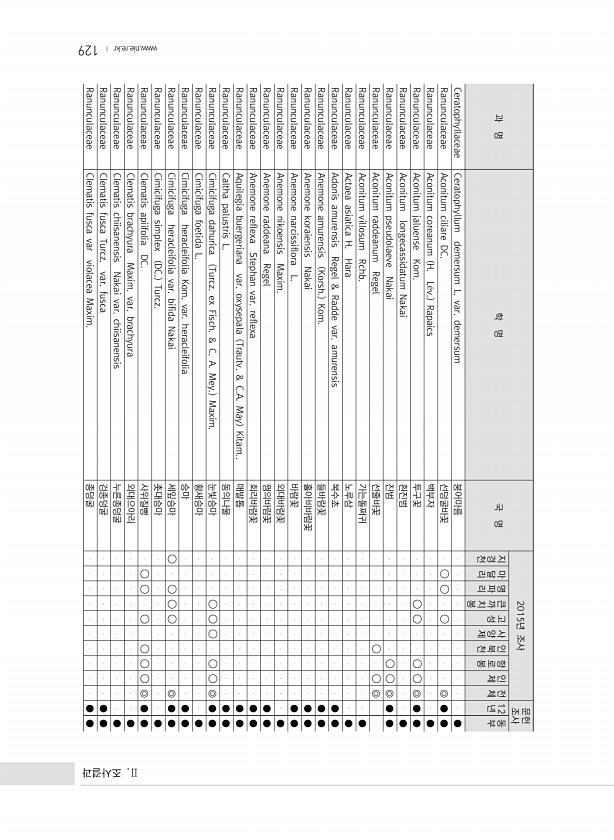 129 과 명 학 명 국 명 2015년 조사 문헌 조사 지경천 마달리 명파리 큰까치봉 고성 사양제 인북천 향로봉 인제 전체 12 년 동부 Ceratophyllaceae Ceratophyllum demersum L. var. demersum 붕어마름 ● Ranunculaceae Aconitum ciliare DC. 선덩굴바꽃 ? ? ? ◎ ● ● Ranunculaceae Aconitum coreanum H. L?v. Rapaics 백부자 ● Ranunculaceae Aconitum jaluense Kom. 투구꽃 ? ? ? ? ◎ ● ● Ranunculaceae Aconitum longecassidatu...
