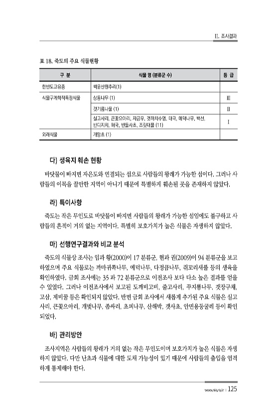 II. 조사결과 www.nie.re.kr ?125 구 분 식물 명 분류군 수 등 급 한반도고유종 백운산원추리 1 식물구계학적특정식물 상동나무 1 Ⅲ 갯기름나물 1 Ⅱ 실고사리, 큰꽃으아리, 자금우, 갯까치수염, 대극, 예덕나무, 백선, 반디지치, 해국, 반들사초, 조릿대풀 11 Ⅰ 외래식물 개망초 1 표 18. 죽도의 주요 식물현황 바닷물이 빠지면 자은도와 연결되는 섬으로 사람들의 왕래가 가능한 섬이다. 그러나 사 람들의 이목을 끌만한 지역이 아니기 때문에 특별하게 훼손된 곳을 존재하지 않았다. 죽도는 작은 무인도로 바닷물이 빠지면 사람들의 왕래가 가능한 섬임에도 불구하고 사 람들의 흔적이 거의 없는 지역이다. 특별히 보호가치가 높은 식물은 자생하지 않았다. 죽도의 식물상 조사는 임과 황 2000 이 17 ...
