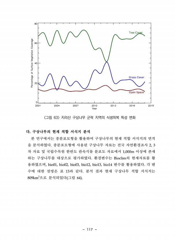 117 그림 63 지리산 구상나무 군락 지역의 식생피복 특성 변화 다. 구상나무의 현재 적합 서식지 분석 본 연구에서는 종분포모형을 활용하여 구상나무의 현재 적합 서식지의 면적 을 분석하였다. 종분포모형에 사용된 구상나무 자료는 전국 자연환경조사 2, 3 차 자료 및 국립수목원 한반도 관속식물 분포도 자료에서 1,000m 이상에 존재 하는 구상나무를 대상으로 평가하였다. 환경변수는 Bioclim의 현재자료를 활 용하였으며, bio01, bio02, bio03, bio12, bio13, bio14 변수를 활용하였다. 각 변 수에 대한 설명은 표 13과 같다. 분석 결과 현재 구상나무 적합 서식지는 809km2으로 분석되었다 그림 64