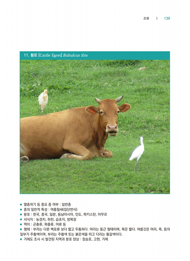 조류 ┃ 139 11. 황로 [Cattle Egret] Bubulcus ibis ■ 멸종위기 등 중요 종 여부 일반종 ■ 종의 일반적 특성 여름철새 집단번식 ■ 분포 한국, 중국, 일본, 동남아시아, 인도, 파키스탄, 아무르 ■ 서식지 농경지, 하천, 습초지, 방목장 ■ 먹이 곤충류, 파충류, 어류 등 ■ 형태 부리는 다른 백로류 보다 짧고 두툼하다. 머리는 둥근 형태이며, 목은 짧다. 여름깃은 머리, 목, 등의 일부가 주황색이며, 부리는 주황색 또는 붉은색을 띠고 다리는 황갈색이다. ■ 거제도 조사 시 발견된 지역과 분포 양상 장승포, 고현,거제
