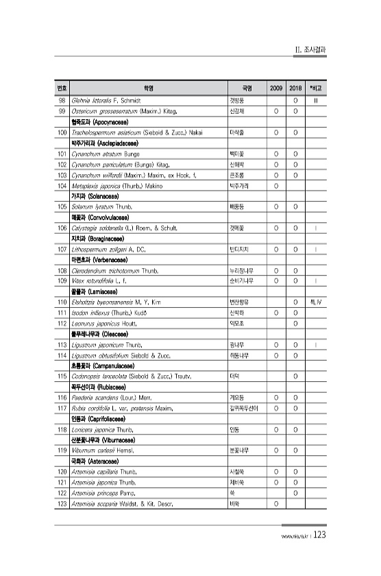 II. 조사결과 www.nie.re.kr ?123 번호 학명 국명 2009 2018 *비고 98 Glehnia littoralis F. Schmidt 갯방풍 O Ⅲ 99 Ostericum grosseserratum Maxim. Kitag. 신감채 O O 협죽도과 Apocynaceae 100 Trachelospermum asiaticum Siebold & Zucc. Nakai 마삭줄 O O 박주가리과 Asclepiadaceae 101 Cynanchum atratum Bunge 백미꽃 O O 102 Cynanchum paniculatum Bunge Kitag. 산해박 O O 103 Cynanchum wilfordii Maxim. Maxim. ex Hook. f. 큰조롱 O O 104 Metaplexis japo...