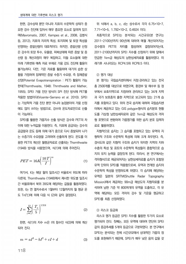 생태계에 대한 기후변화 리스크 평가 118 한편, 강수상태 뿐만 아니라 지표의 수문학적 상태가 중 요한 강수 진단에 있어서 매우 중요한 요소로 알려져 있으 며 Mavromatis, 2007, Kempes et al., 2008, 김병식 등, 2012 , 지표의 지리적 특성, 토지피복 및 토양 특성을 반영하는 증발산량이 대표적이다. 하지만, 증발산량 산정 은 강수의 토양 투수, 유출량, 피복상태에 따른 증발 및 증 산량 등 계산과정이 매우 복잡하고, 이들 요소들에 대한 미래 기후변화 예측 자료 부재로 가뭄 강도 진단에 활용이 불가능하다. 다만, 기온 자료를 활용하여 대기의 습한 상 황을 가정하여 잠재적인 증발 수증기 수요량, 즉 잠재증발 산양 Potental Evapotranspiration PET 활용이 가...