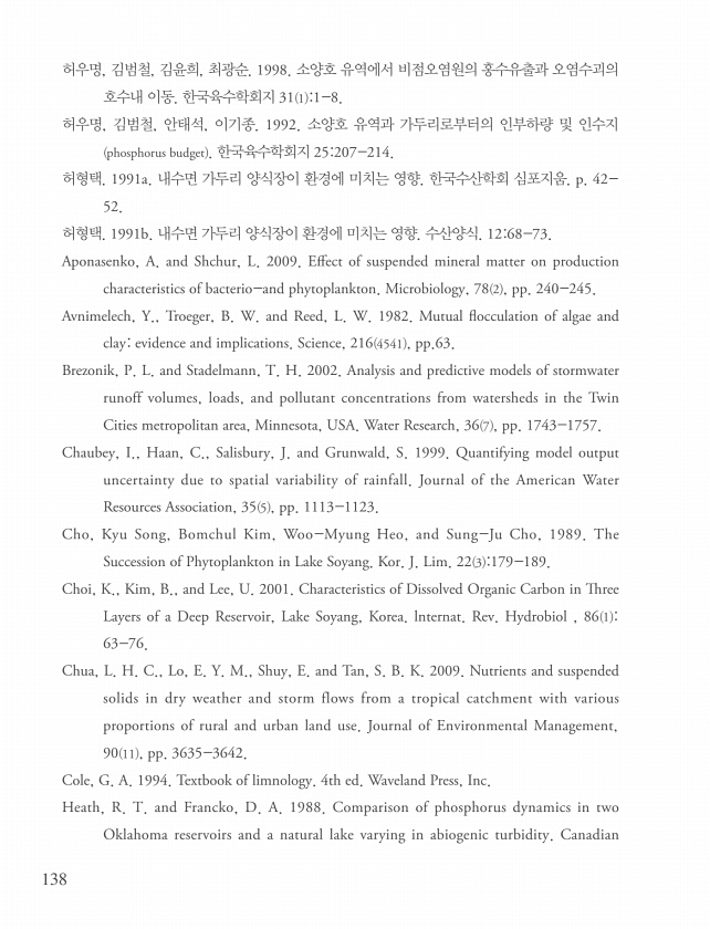 138 허우명, 김범철, 김윤희, 최광순. 1998. 소양호 유역에서 비점오염원의 홍수유출과 오염수괴의 호수내 이동. 한국육수학회지 31 1 1-8. 허우명, 김범철, 안태석, 이기종. 1992. 소양호 유역과 가두리로부터의 인부하량 및 인수지 phosphorus budget 한국육수학회지 25207-214. 허형택. 1991a. 내수면 가두리 양식장이 환경에 미치는 영향. 한국수산학회 심포지움. p. 42- 52. 허형택. 1991b. 내수면 가두리 양식장이 환경에 미치는 영향. 수산양식. 1268-73. Aponasenko, A. and Shchur, L. 2009. Efect of suspended mineral matter on production characteristics of bacterio-a...