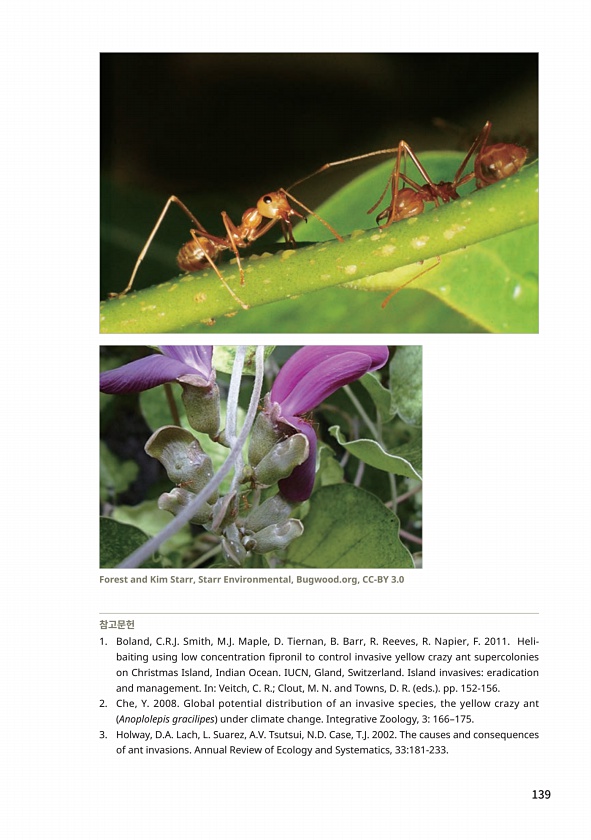 139 참고문헌 1. Boland, C.R.J. Smith, M.J. Maple, D. Tiernan, B. Barr, R. Reeves, R. Napier, F. 2011. Helibaiting using low concentration fipronil to control invasive yellow crazy ant supercolonies on Christmas Island, Indian Ocean. IUCN, Gland, Switzerland. Island invasiveseradication and management. InVeitch, C. R.; Clout, M. N. and Towns, D. R. eds. pp. 152-156. 2. Che, Y. 2008. Global potential di...