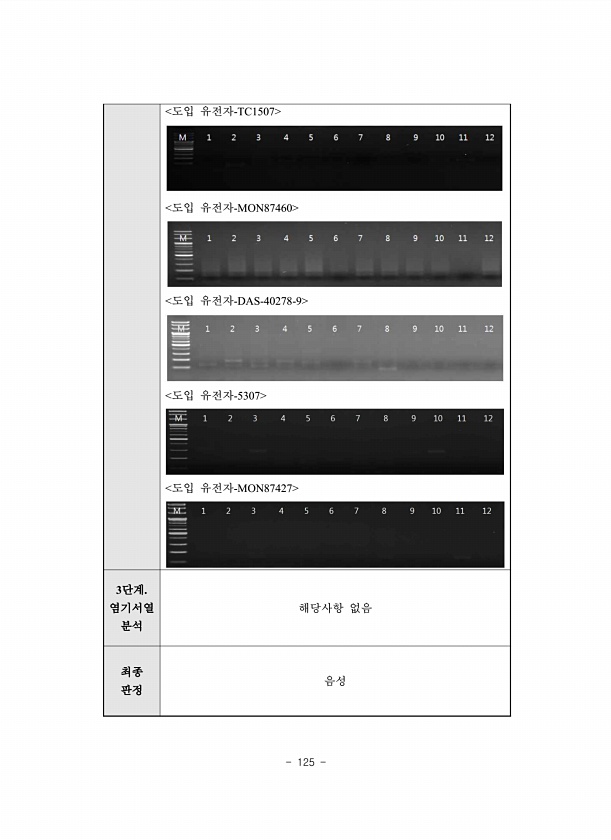 125 도입 유전자-TC1507 도입 유전자-MON87460 도입 유전자-DAS-40278-9 도입 유전자-5307 도입 유전자-MON87427 3단계. 염기서열 분석 해당사항 없음 최종 판정음성