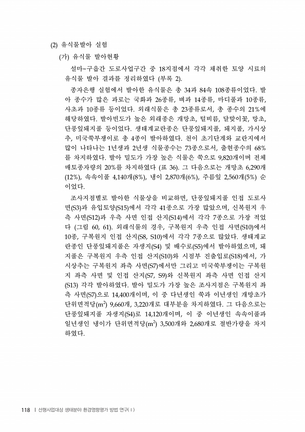 유식물발아 실험 가 유식물 발아현황 설마 구읍간 도로사업구간 중 지점에서 각각 채취한 토양 시료의 유식물 발아 결과를 정리하였다 부록 종자은행 실험에서 발아한 유식물은 총 과 속 종류이었다 발 아 종수가 많은 과로는 국화과 종류 벼과 종류 마디풀과 종류 사초과 종류 등이었다 외래식물은 총 종류로서 총 종수의 에 해당하였다 발아빈도가 높은 외래종은 개망초 털비름 달맞이꽃 망초 단풍잎돼지풀 등이었다 생태계교란종은 단풍잎돼지풀 돼지풀 가시상 추 미국쑥부쟁이로 총 종이 발아하였다 천이 초기단계와 교란지에서 많이 나타나는 년생과 년생 식물종수는 종으로서 출현종수의 를 차지하였다 발아 밀도가 가장 높은 식물은 쑥으로 개이며 전체 매토종자량의 를 차지하였다 표 그 다음으로는 개망초 개 속속이풀 개 냉이 개 주름잎 개 순...