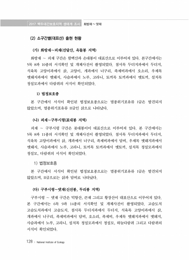 2017 백두대간보호지역 생태계 조사 화방재 댓재 128 ? National Institute of Ecology 2 소구간별 대표산 출현 현황 가 화방재∼피재 선달산, 옥돌봉 지역 화방재 ∼ 피재 구간은 함백산과 은대봉이 대표산으로 이루어져 있다. 본구간에서는 5목 8과 10종의 서식확인 및 개체사진이 촬영되었다. 첨서목 두더지과에서 두더지, 식육목 고양이과에서 삵, 고양이, 개과에서 너구리, 족제비과에서 오소리, 우제목 멧돼지과에서 멧돼지, 사슴과에서 노루, 고라니, 토끼목 토끼과에서 멧토끼, 설치목 청설모과에서 다람쥐의 서식이 확인되었다. 1 법정보호종 본 구간에서 서식이 확인된 법정보호종으로는 멸종위기포유류 I급은 발견되지 않았으며, 멸종위기포유류 II급인 삵으로 나타났다. 나 피재∼구부시령 표대봉 ...