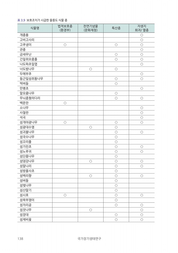 138 국가장기생태연구 식물명 법적보호종 환경부 천연기념물 문화재청 특산종 희귀/ 멸종 자생지 개종용 ○ 고비고사리 ○ 고추냉이 ○ ○ ○ 관중 ○ 금새우난 ○ ○ 긴잎쥐오줌풀 ○ ○ 나도파초일엽 ○ 너도밤나무 ○ ○ 두메부추 ○ 둥근잎섬쥐똥나무 ○ ○ 떡버들 ○ 만병초 ○ 말오줌나무 ○ 무늬좀꿩의다리 ○ ○ 백운란 ○ 소나무 ○ 사철란 ○ 석곡 ○ 섬개야광나무 ○ ○ ○ 섬광대수염 ○ ○ 섬괴불나무 ○ ○ 섬국수나무 ○ 섬꼬리풀 ○ 섬기린초 ○ ○ 섬노루귀 ○ ○ 섬단풍나무 ○ 섬댕강나무 ○ ○ ○ 섬말나리 ○ ○ 섬방울사초 ○ 섬백리향 ○ ○ ○ 섬버들 ○ 섬벚나무 ○ 섬산딸기 ○ 섬시호 ○ ○ ○ 섬쑥부쟁이 ○ 섬자리공 ○ ○ 섬잣나무 ○ ○ 섬장대 ○ ○ 섬제비꽃 ○ ○ 표 3.9 보호조치가 시급한 ...