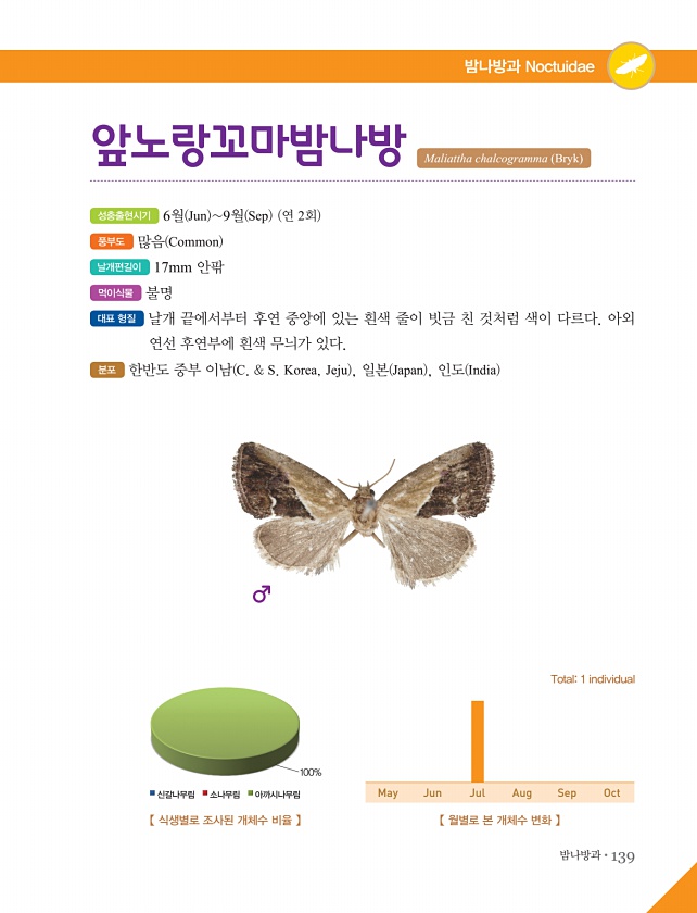 밤나방과?139 밤나방과 Noctuidae 성충출현시기 6월 Jun 9월 Sep 연 2회 풍부도 많음 Common 날개편길이 17mm 안팎 먹이식물 불명 대표 형질 날개 끝에서부터 후연 중앙에 있는 흰색 줄이 빗금 친 것처럼 색이 다르다. 아외 연선 후연부에 흰색 무늬가 있다. 분포 한반도 중부 이남 C. & S. Korea, Jeju , 일본 Japan , 인도 India 앞노랑꼬마밤나방 Maliattha chalcogramma Bryk 【 월별로 본 개체수 변화 】 Total1 individual May Jun Jul Aug Sep Oct 【 식생별로 조사된 개체수 비율 】 100% 신갈나무림 소나무림아까시나무림