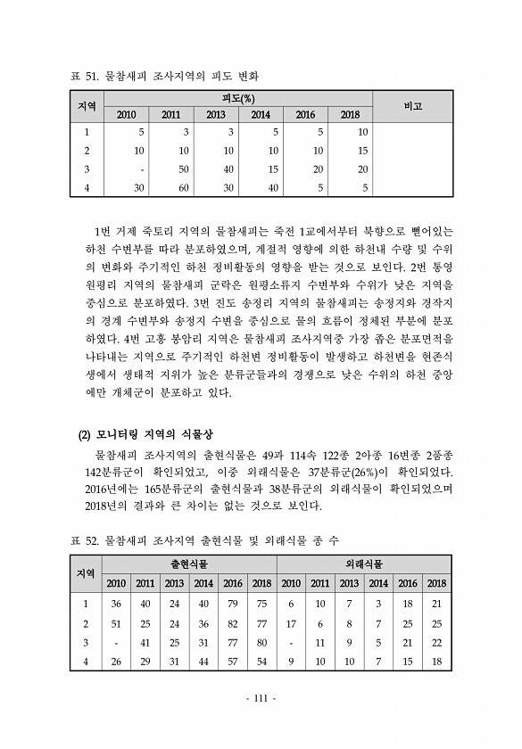 111 지역 피도 % 비고 2010 2011 2013 2014 2016 2018 1 5 3 3 5 5 10 2 10 10 10 10 10 15 3 50 40 15 20 20 4 30 60 30 40 5 5 표 51. 물참새피 조사지역의 피도 변화 1번 거제 죽토리 지역의 물참새피는 죽전 1교에서부터 북향으로 뻗어있는 하천 수변부를 따라 분포하였으며, 계절적 영향에 의한 하천내 수량 및 수위 의 변화와 주기적인 하천 정비활동의 영향을 받는 것으로 보인다. 2번 통영 원평리 지역의 물참새피 군락은 원평소류지 수변부와 수위가 낮은 지역을 중심으로 분포하였다. 3번 진도 송정리 지역의 물참새피는 송정지와 경작지 의 경계 수변부와 송정지 수변을 중심으로 물의 흐름이 정체된 부분에 분포 하였다. 4번 고흥 봉암리 지역...