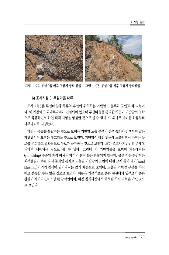 i. 지형·경관 www.nie.re.kr ?129 6 6조사지점6은 무섬마을의 하류의 우안에 위치하는 기반암 노출부와 포인트 바 지형이 다. 이 지점에도 외나무다리가 건설되어 있으며 무섬마을을 통과한 하천이 기반암의 영향 으로 곡류하면서 하천 퇴적 지형을 형성한 것으로 볼 수 있다. 이 외나무 다리를 하류부외 나무다리로 지칭한다. 하천의 곡류를 유발하는 것으로 보이는 기반암 노출 부분의 경우 풍화가 진행되지 않은 기반암이며 표면은 매끄러운 것으로 보인다. 기반암이 하천 인근에 노출되면서 하천은 유 로를 우회하고 결과적으로 유로가 곡류하는 것으로 보인다. 또한 유로가 기반암의 존재에 의하여 제한되는 것으로 볼 수 있다. 그런데 이 기반암들을 표면이 매끈해지는 polishing 수준의 흔적 이외의 마식의 흔적 ...