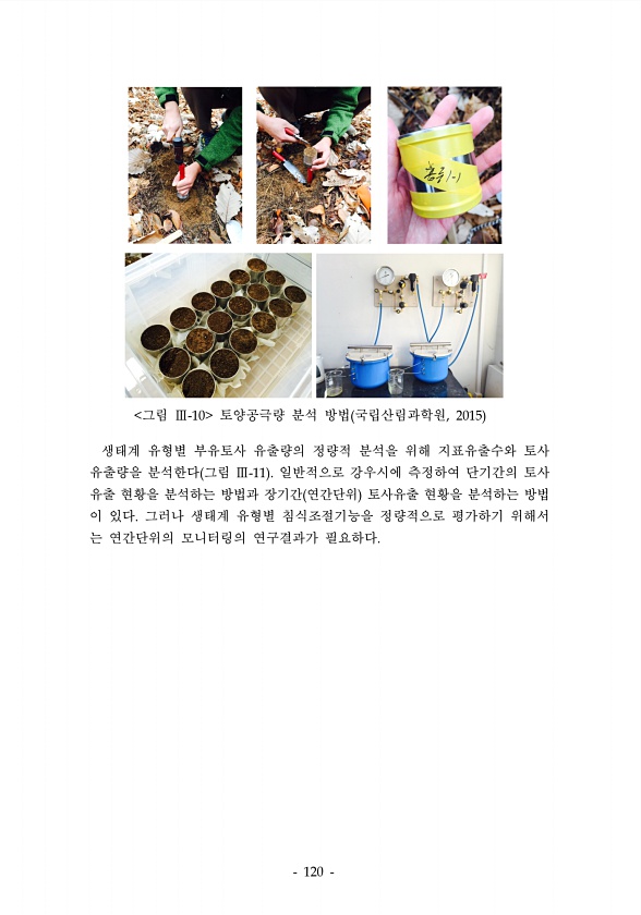 그림 토양공극량 분석 방법 국립산림과학원 생태계 유형별 부유토사 유출량의 정량적 분석을 위해 지표유출수와 토사 유출량을 분석한다 그림 일반적으로 강우시에 측정하여 단기간의 토사 유출 현황을 분석하는 방법과 장기간 연간단위 토사유출 현황을 분석하는 방법 이 있다 그러나 생태계 유형별 침식조절기능을 정량적으로 평가하기 위해서 는 연간단위의 모니터링의 연구결과가필요하다
